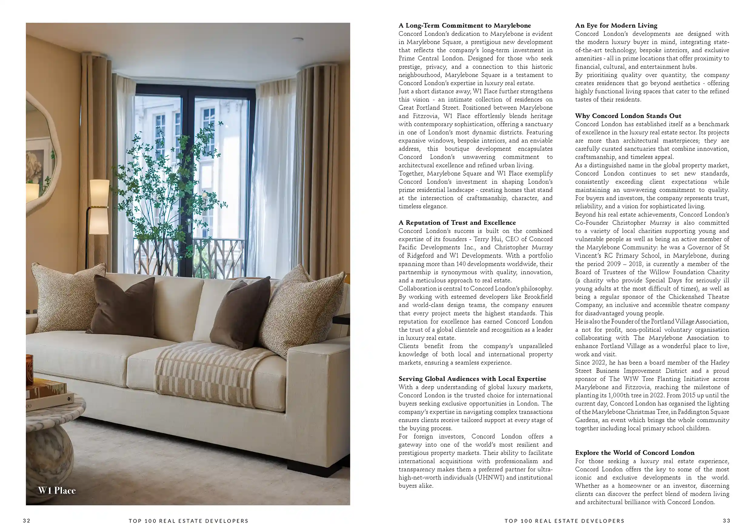 Concord London is proud to announce its prestigious recognition as one of the Top 100 Luxury Real Estate Developers Worldwide for 2024, a testament to our visionary leadership and unwavering dedication to excellence. Renowned for transforming Prime Central London’s landscape through iconic developments like Principal Tower, W1 Place and Marylebone Square, we seamlessly blend heritage-inspired architecture with cutting-edge innovation. Our commitment to crafting vibrant, sustainable communities and delivering unparalleled luxury living experiences has solidified our global reputation. Partnering with world-class architects and prioritizing meticulous craftsmanship, we continue to redefine urban sophistication. Explore our award-winning portfolio and discover how Concord London shapes the future of luxury living.